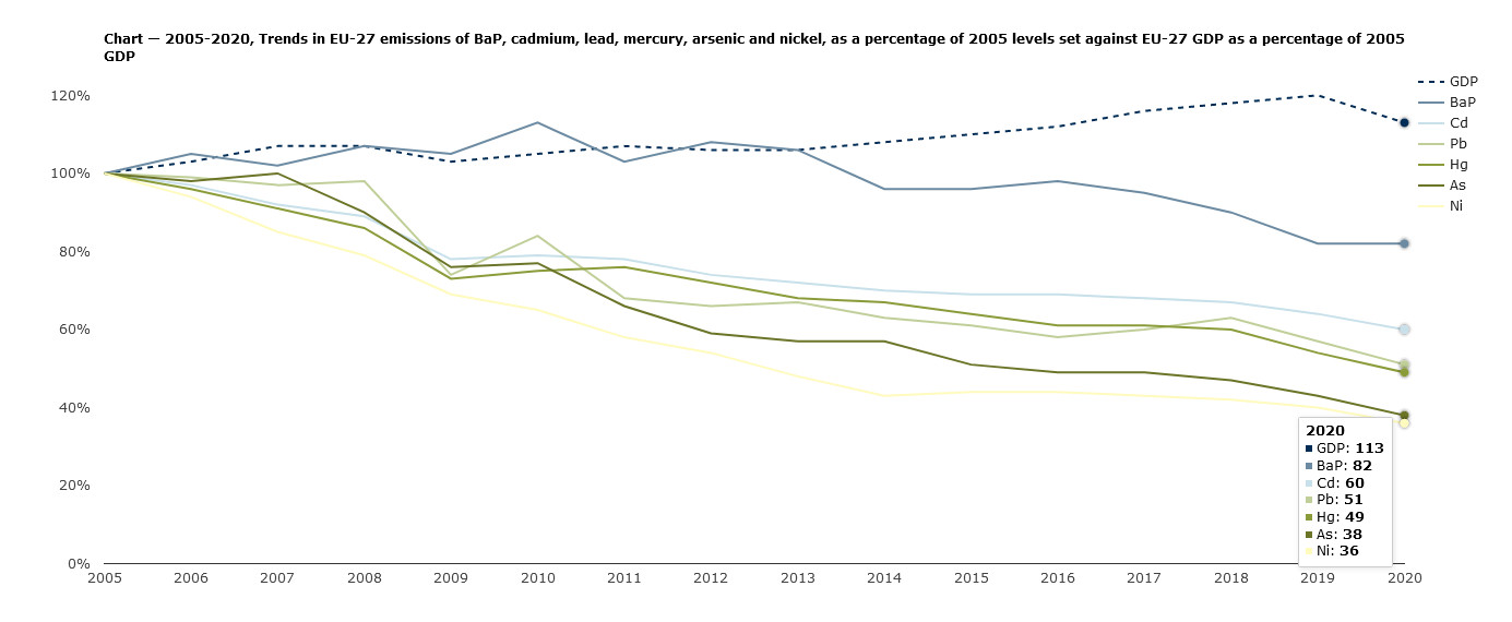 La figura 2 mostra le tendenze delle emissioni totali di metalli pesanti e benzo[a]pirene (BaP) nell’UE-27, indicizzate come percentuale del loro valore nell’anno di riferimento 2005 e confrontate con il PIL dell’UE-27 come percentuale del valore 2005. Le emissioni di nichel (Ni) e arsenico (As) sono diminuite di oltre il 60% (64% e 62%, rispettivamente), mentre le emissioni di mercurio (Hg), piombo (Pb) e cadmio (Cd) sono diminuite del 51%, 49% e 40%, rispettivamente. Le emissioni di BaP sono diminuite solo del 18%.