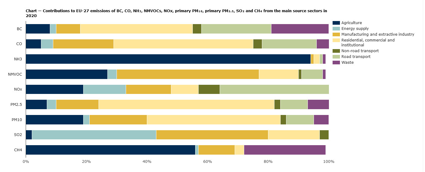 I settori economici che sono le fonti a monte delle emissioni di inquinanti atmosferici variano a seconda dell’inquinante. La figura 3 illustra i contributi dei principali settori di origine alle emissioni dei principali inquinanti atmosferici nell’UE-27 nel 2020