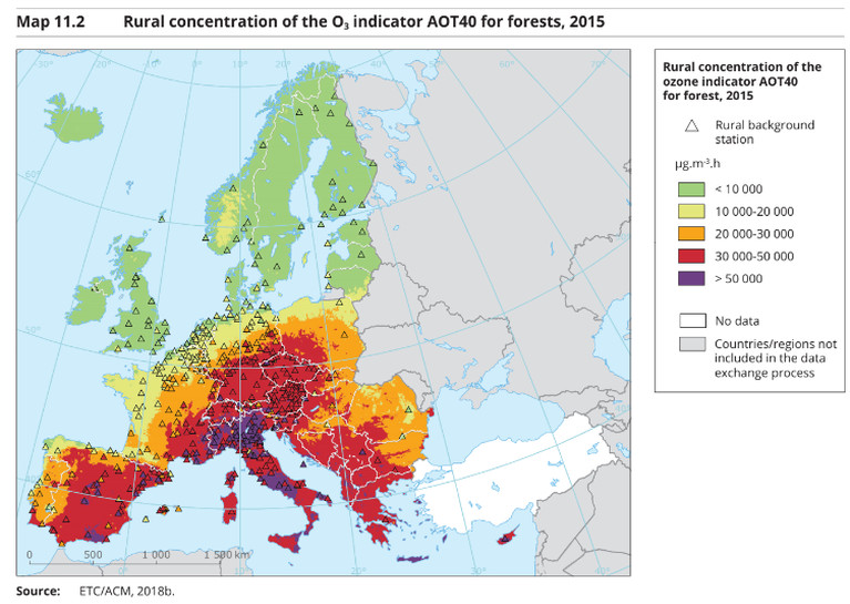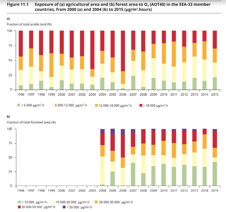 Secondo l’Eea, molte aree naturali dell’Europa centrale e meridionale, sono a rischio a causa dell’esposizione ai livelli attuali di O3, che possono cambiare la composizione delle specie vegetali, la fioritura e anche la produzione di semi.