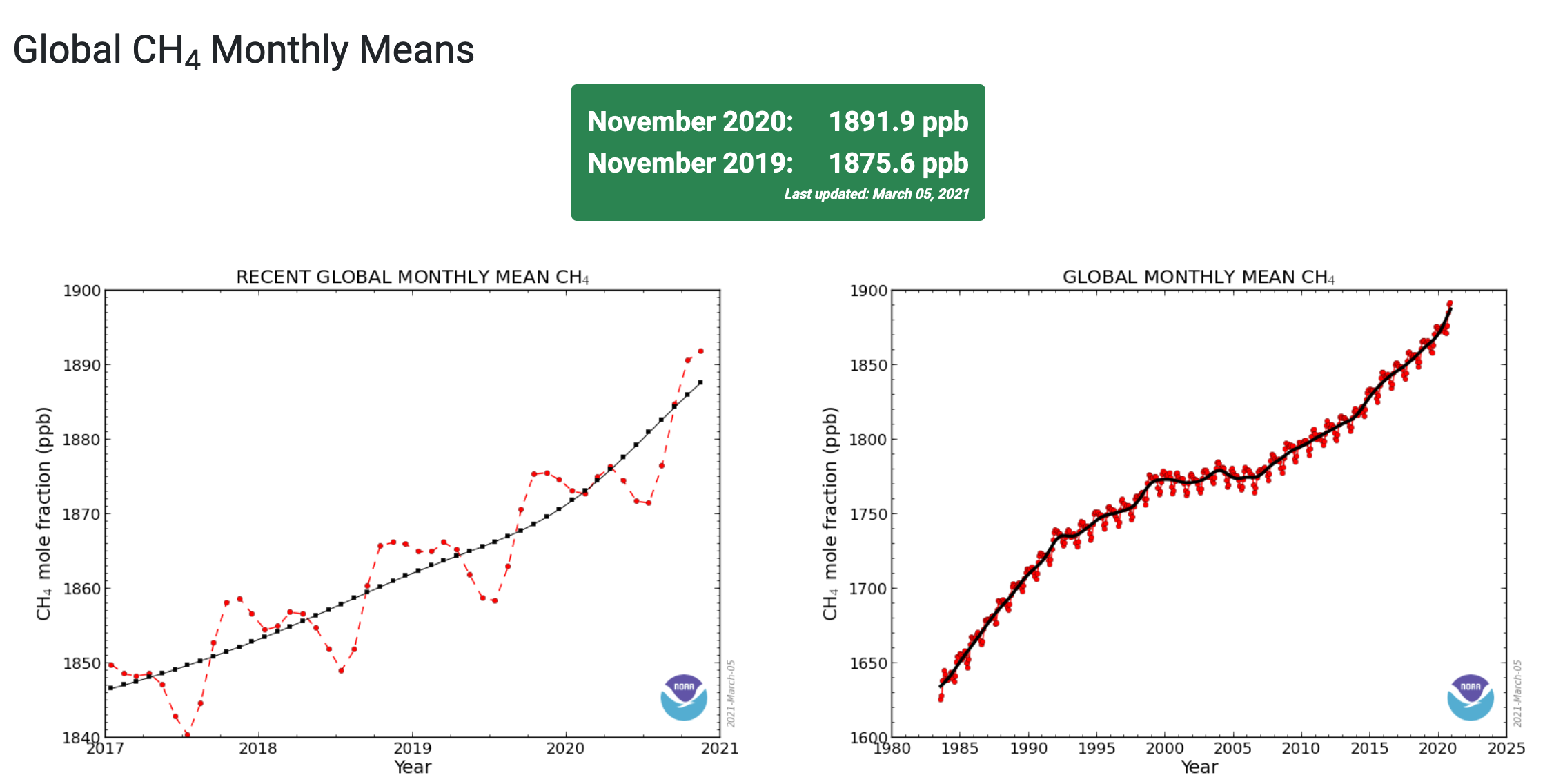Questi grafici mostrano l’aumento del carico atmosferico globale medio mensile di metano come analizzato dalle misurazioni raccolte dalla rete globale di riferimento sui gas a effetto serra della NOAA. Credito: NOAA Global Monitoring Laboratory.