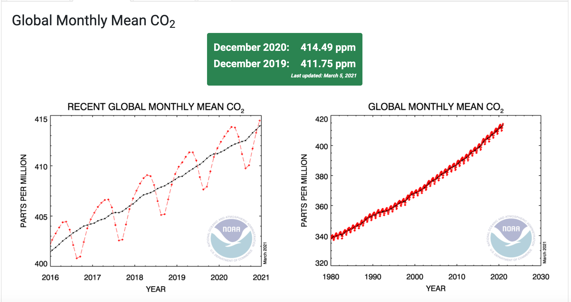 La media globale della superficie per l’anidride carbonica (CO2), calcolata dalle misurazioni raccolte presso le sedi di campionamento remote della NOAA, è stata di 412,5 parti per milione (ppm) nel 2020, con un aumento di 2,6 ppm durante l’anno. Il tasso globale di aumento è stato il quinto più alto nel record di 63 anni della NOAA, dopo il 1987, 1998, 2015 e 2016. La media annuale al Mauna Loa Observatory della NOAA alle Hawaii è stata di 414,4 ppm durante il 2020.
