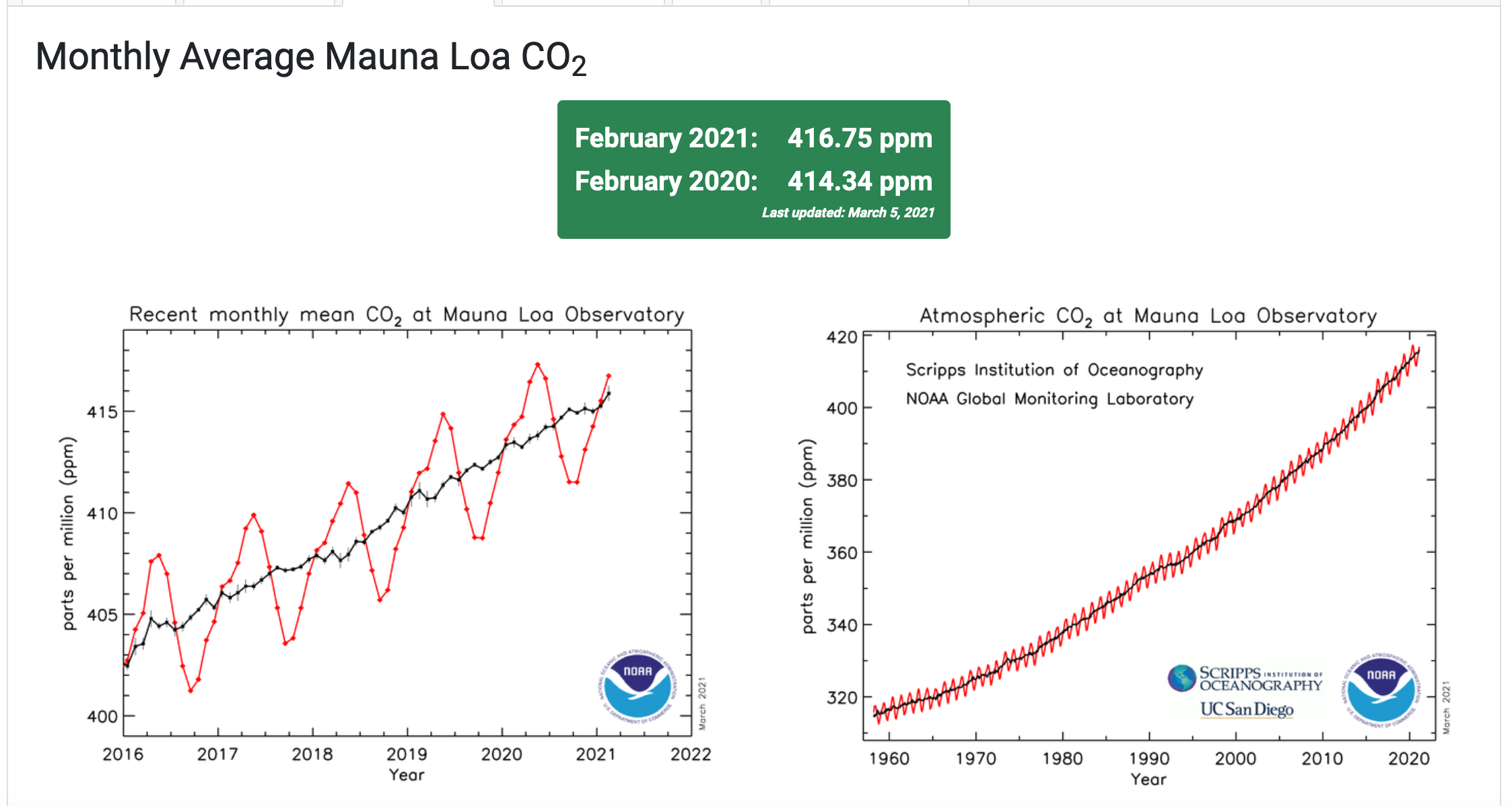 In questi grafici sono rappresentati gli aumenti delle misurazioni medie mensili di anidride carbonica presso il Mauna Loa Observatory della NOAA. Credito: NOAA Global Monitoring Laboratory.